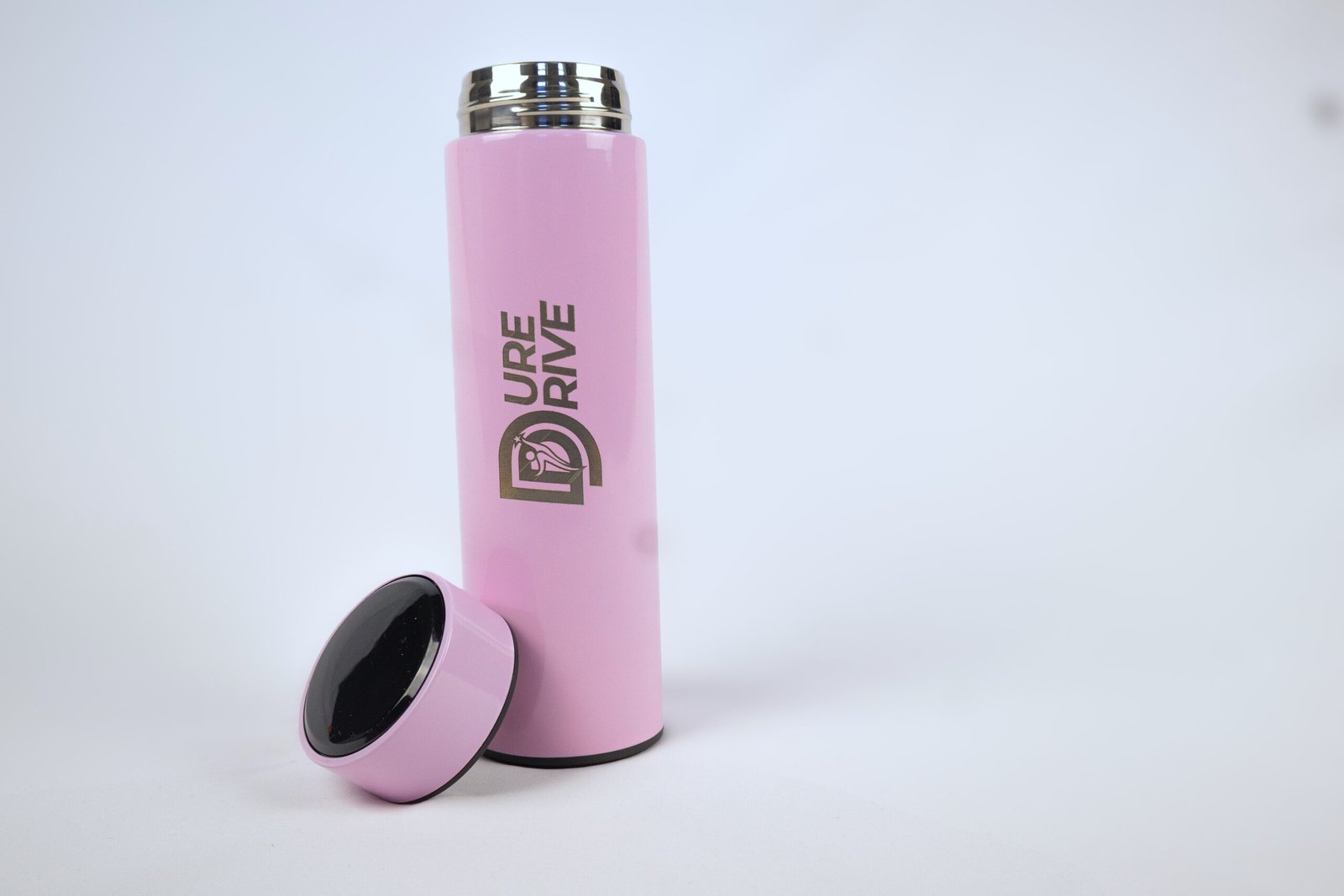 A double-walled, vacuum-insulated bottle with an integrated LED temperature display.